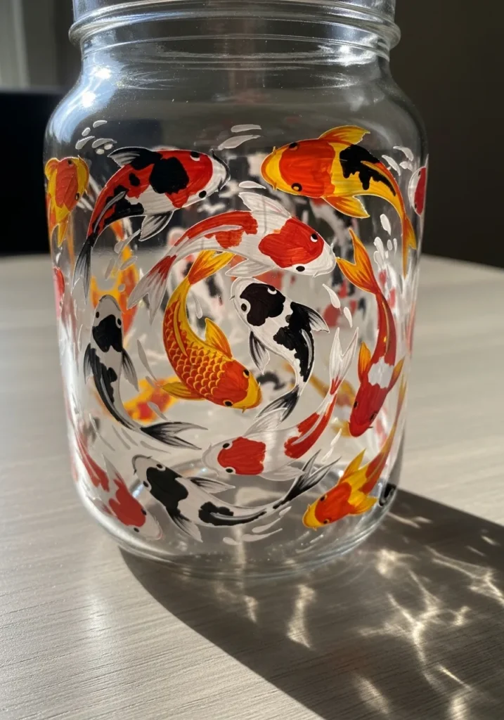 I find fish designs so relaxing to paint because the shapes flow naturally across the surface. Each koi can have its own pattern which makes the jar feel unique and artistic. The finished piece almost looks like a tiny pond captured in glass. I think it would look stunning with a candle or fairy lights inside.