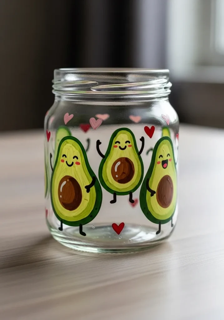 This playful jar is decorated with smiling avocado halves painted in soft green shades. Each avocado has a tiny happy face and a warm brown pit in the center. Small red hearts are scattered between the avocados which makes the design feel extra sweet and fun. The bright colors stand out nicely against the clear glass surface.