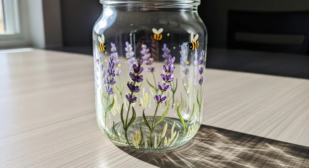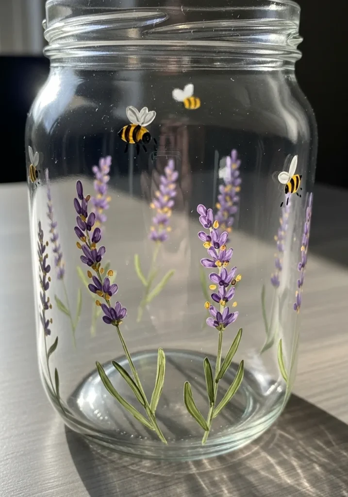 I think floral designs are always relaxing to create and lavender feels especially peaceful. Painting thin stems and small blossoms can feel almost meditative. The little bees add a cute and lively detail that makes the whole jar feel alive. I would love placing this jar on a bedside table with a small candle glowing inside.