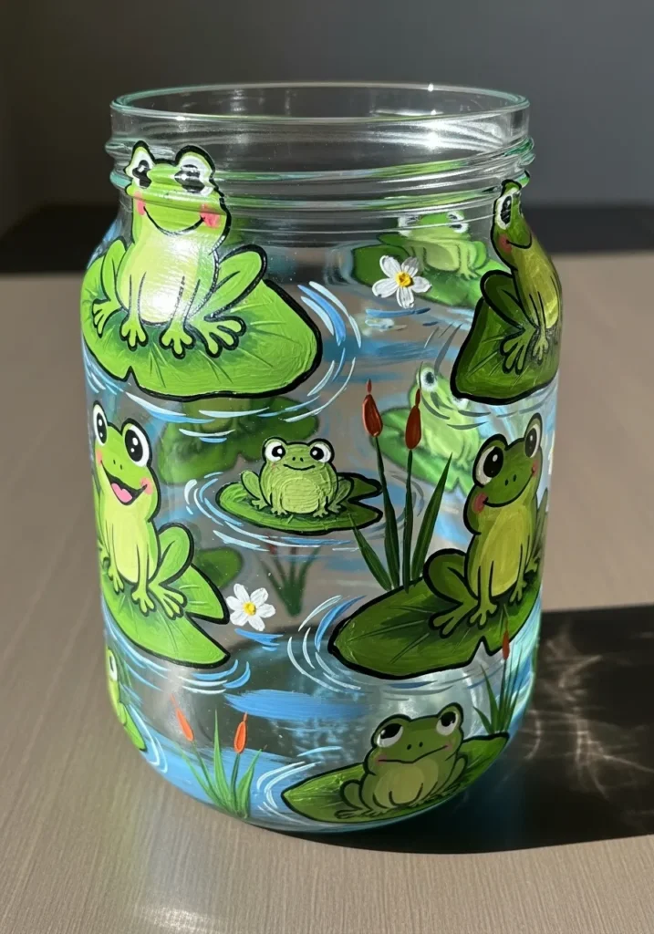 This cheerful jar features a lively pond scene filled with bright green frogs sitting on lily pads. The water is painted in soft blue tones with little ripples and tiny white flowers floating across the surface. Each frog has a playful expression which adds a lot of personality to the design. The vibrant greens and blues create a fresh nature inspired look that wraps beautifully around the glass.
