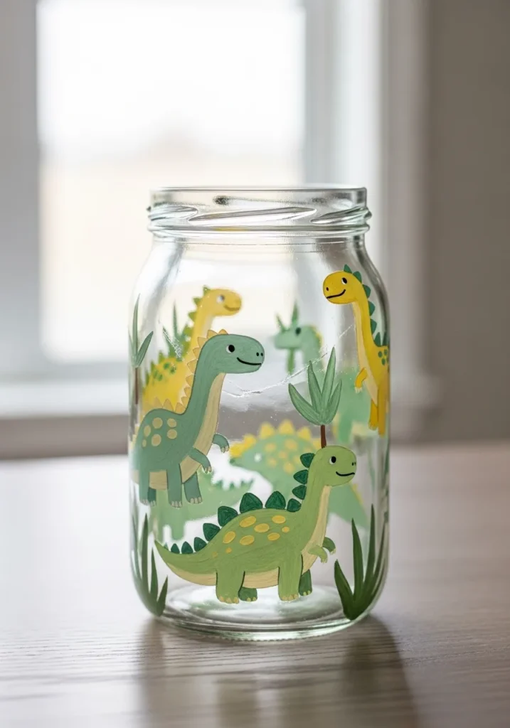 I love crafts that feel whimsical like this one. Painting simple dinosaur shapes is surprisingly easy and it leaves plenty of room to experiment with colors. The finished jar feels cheerful and unique which makes it a great decoration for a shelf or craft desk. I could easily see this holding markers or colored pencils.