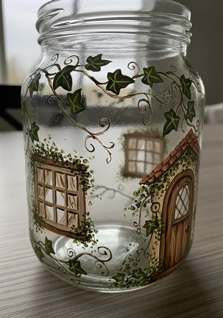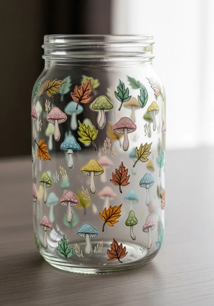 I think designs like this are incredibly charming because every little detail tells a story. Painting small forest elements feels relaxing and creative at the same time. I would enjoy slowly adding mushrooms and leaves around the jar until it looks like a tiny woodland scene. A jar like this would look beautiful on a windowsill with fairy lights inside.