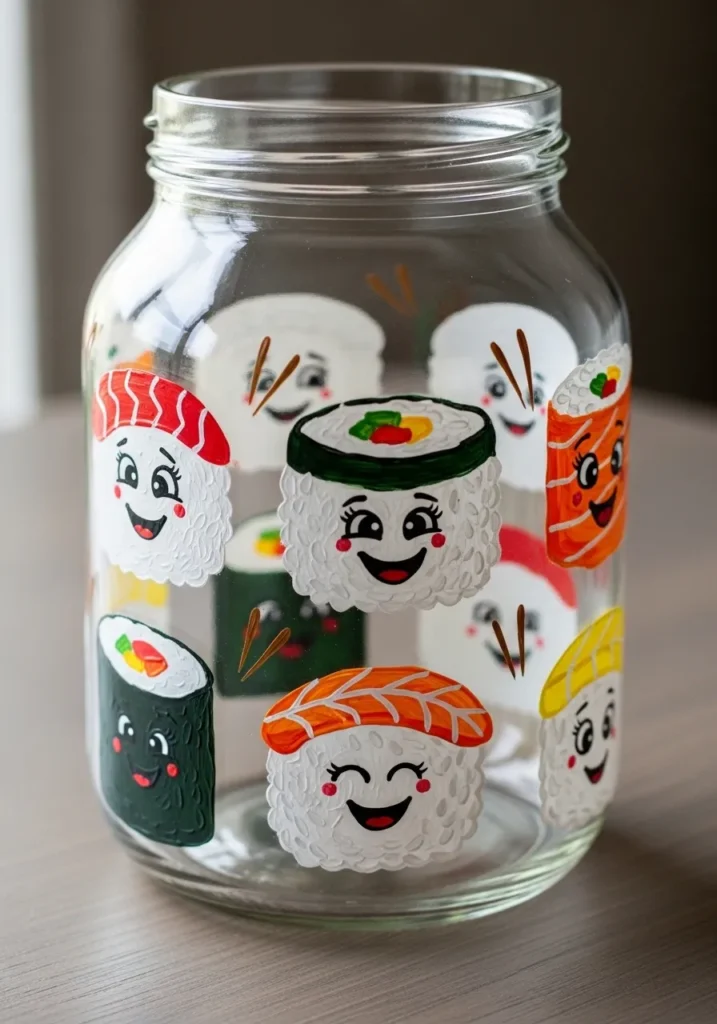 This playful jar is covered with cute sushi characters painted in bright colors. Little sushi rolls, rice pieces, and toppings appear around the glass with cheerful smiling faces. The designs include orange salmon pieces, white rice shapes, and tiny decorative details that give each sushi character its own personality. The colorful mix makes the jar look lively and full of charm.