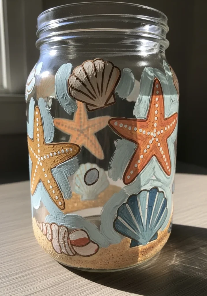 This jar features a calm beach inspired design with hand painted seashells and starfish scattered across the glass. Soft sandy beige tones mix with pale blues and warm coral colors to create a coastal palette. The shells are painted with gentle textures that make them look realistic and natural. The overall design feels light and breezy like a peaceful day at the seaside.