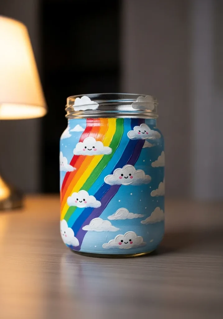 This bright and cheerful jar is painted with a colorful rainbow stretching across a soft blue sky filled with fluffy white clouds. The rainbow features vibrant bands of red, orange, yellow, green, and purple that curve gently around the glass. Small rounded clouds float across the design which makes the whole jar feel light and dreamy. The smooth glass surface allows the colors to shine beautifully when light hits the jar.
