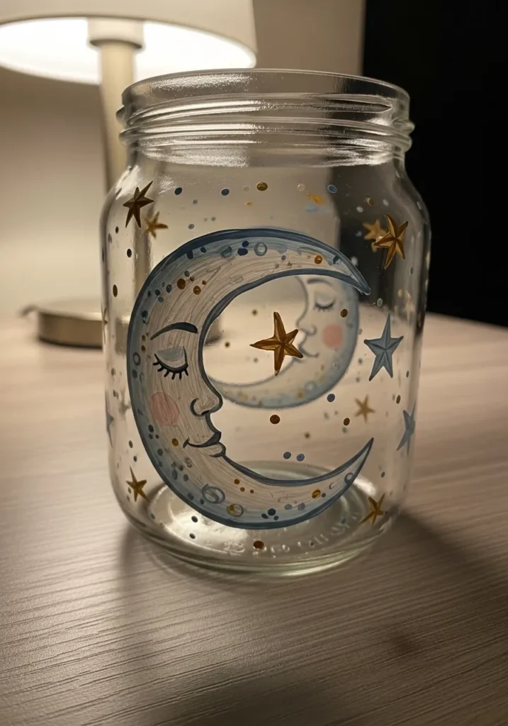 I think jars like this are perfect for relaxing craft nights. Painting moons and stars always feels creative and calming. The design is forgiving so it does not have to look perfect to feel beautiful. I imagine placing a small candle inside and letting the stars shine around the room.