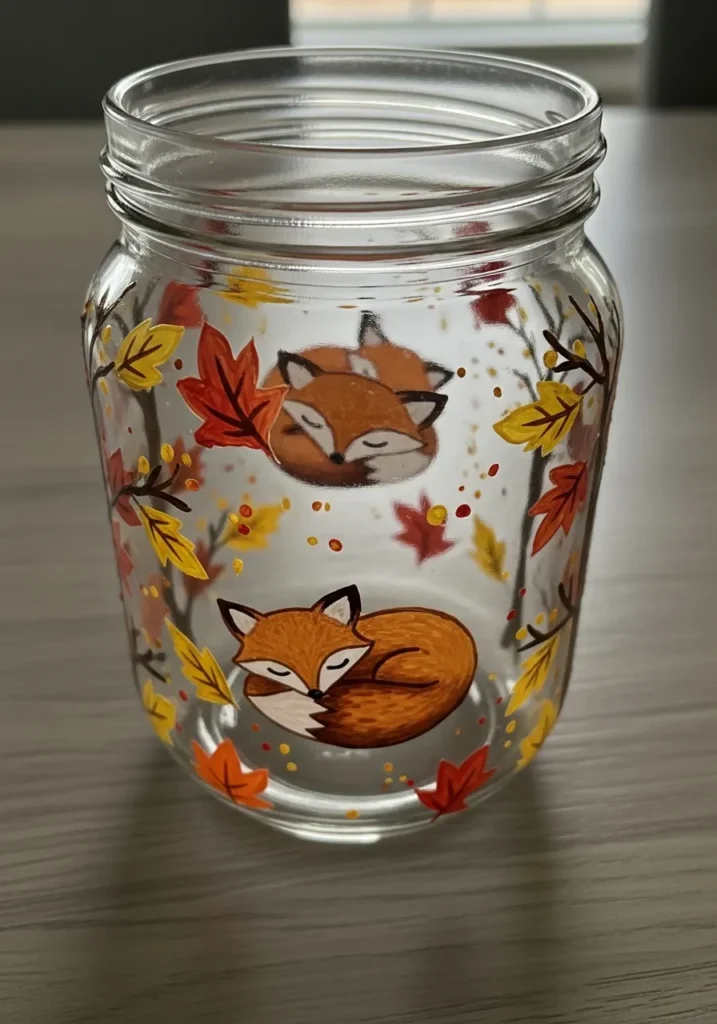 I think autumn themed crafts always feel comforting and creative. Painting little foxes is especially fun because their shapes are soft and playful. Adding colorful leaves around them makes the whole jar feel warm and seasonal. I would happily place this jar on a shelf during fall with fairy lights glowing inside.
