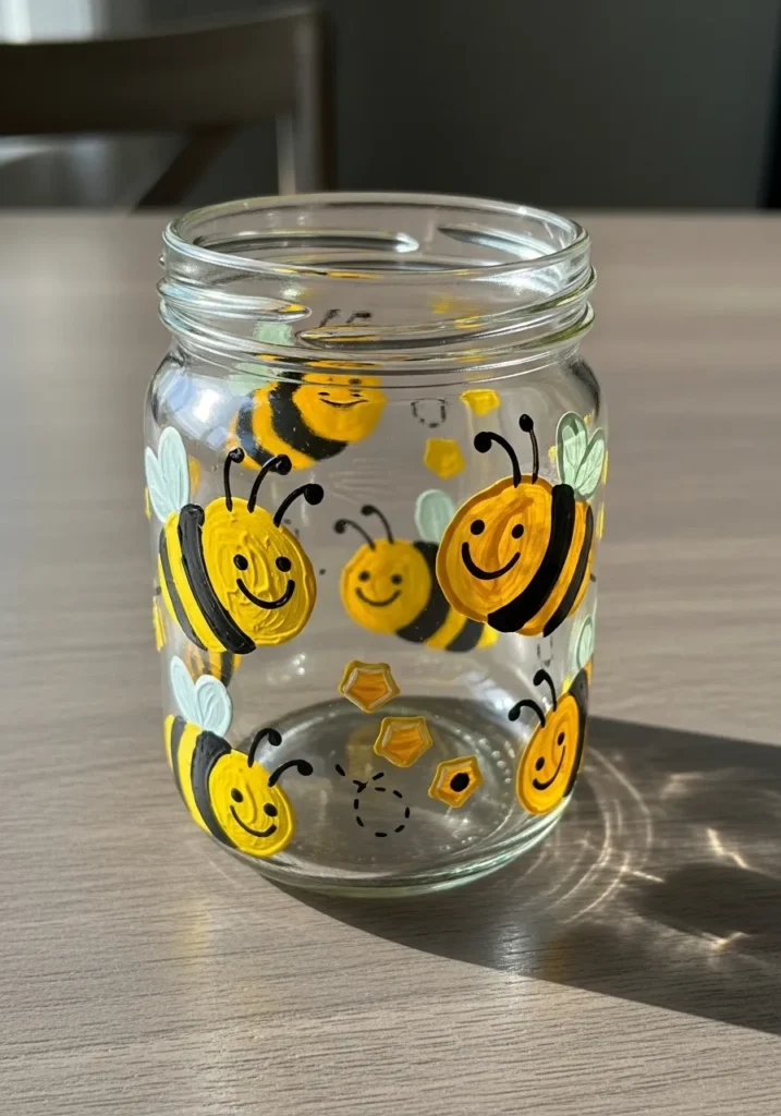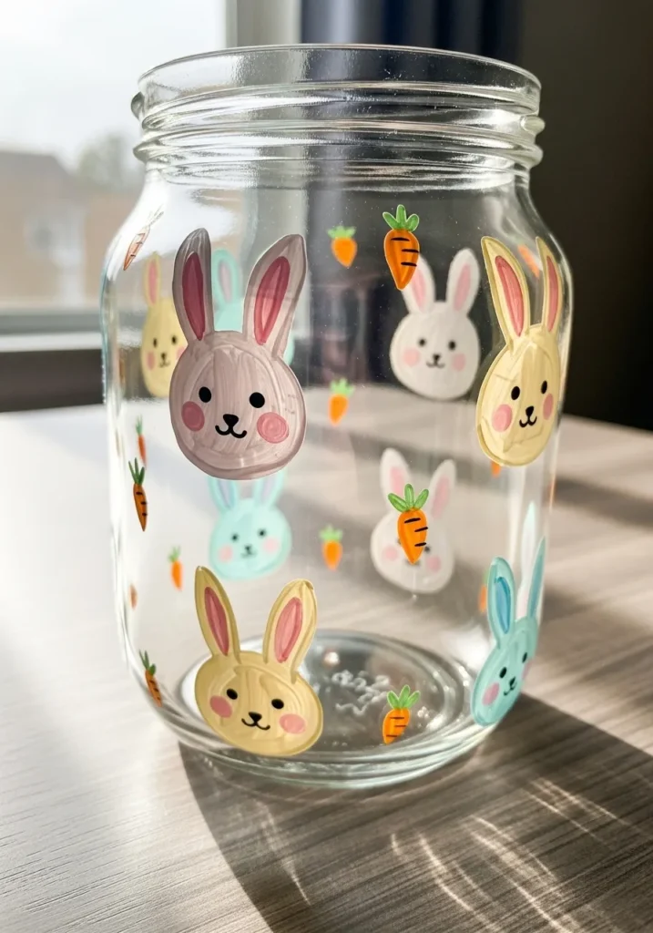 I love animal themed jars like this because they feel playful and easy to make. Bunny faces are simple shapes which makes them perfect for beginner painters. Adding carrots and hearts brings extra charm to the design. I can imagine using this jar to hold candy, craft supplies, or fresh spring flowers.