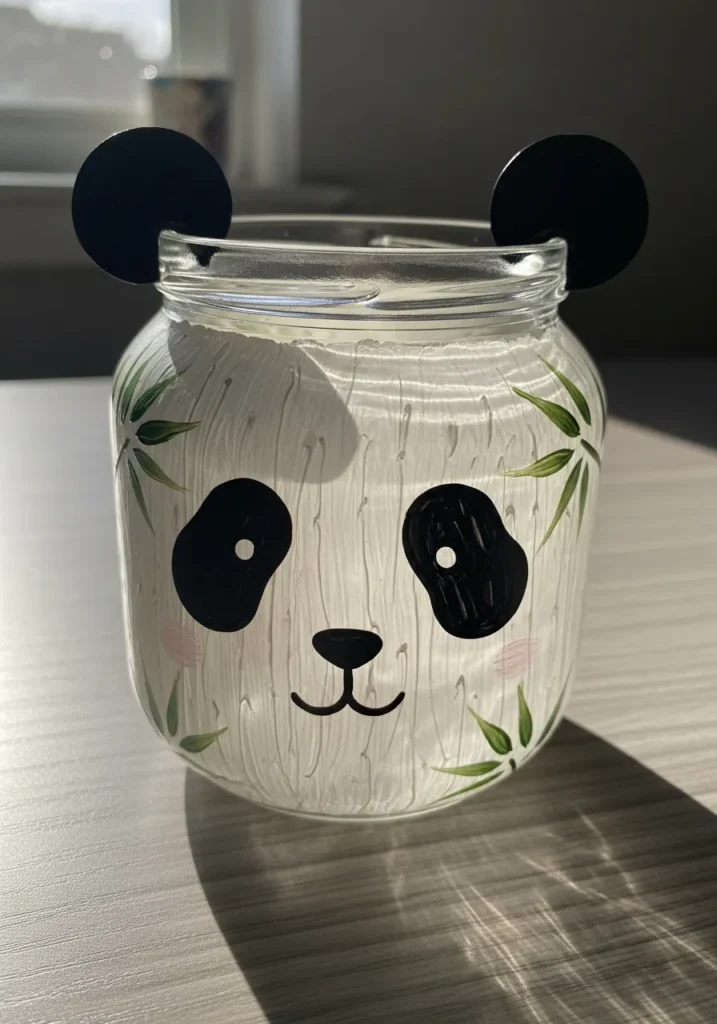 I think animal themed jars are always a hit. The panda design feels playful and surprisingly easy to recreate. Simple shapes and bold colors make the painting process relaxed and fun. I would definitely use a jar like this as a cute container for cotton balls or small craft supplies.