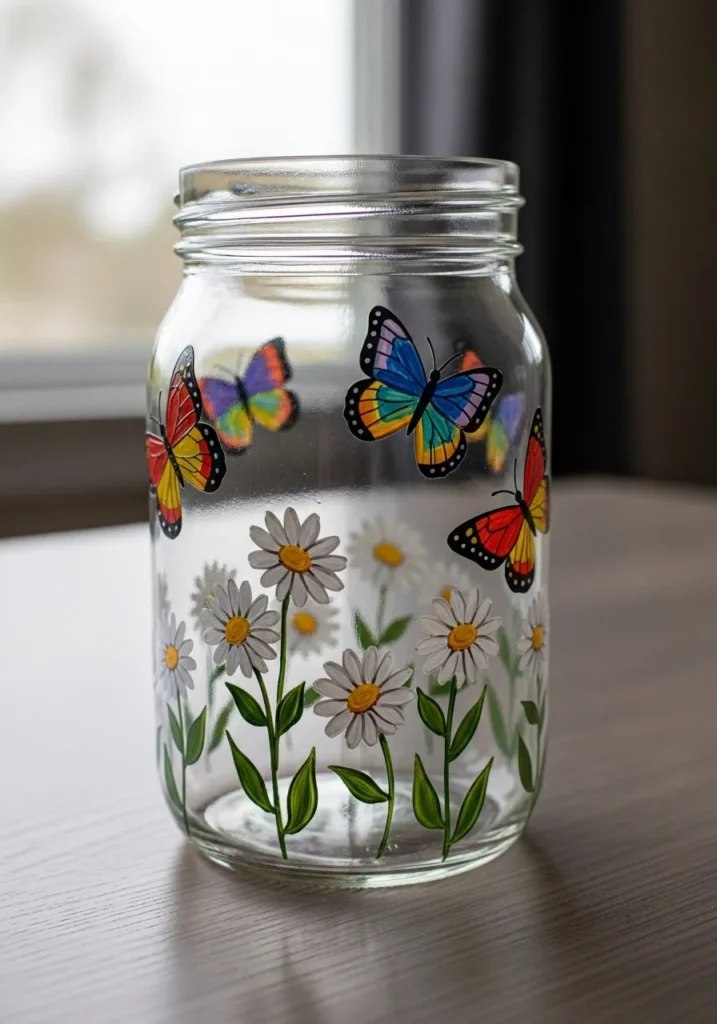 Designs like this make me feel inspired to get creative with tiny details. Painting butterflies is fun because each one can have different colors and patterns. The jar turns into a miniature nature scene that looks lovely on a windowsill. I can easily imagine using it as a vase for a few fresh wildflowers.