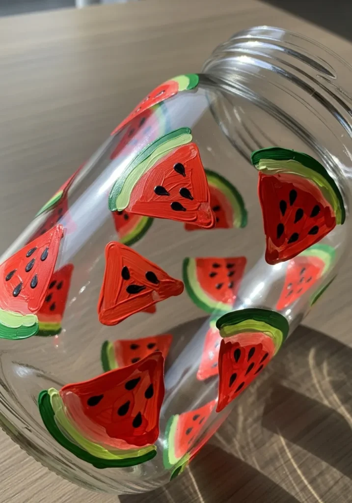 This jar is decorated with bright watermelon slices painted all around the glass surface. Each slice features juicy red fruit with tiny black seeds and a vibrant green rind. The bold colors create a cheerful summer look that stands out instantly. The clear glass between the slices keeps the design light and fresh while letting sunlight sparkle through.