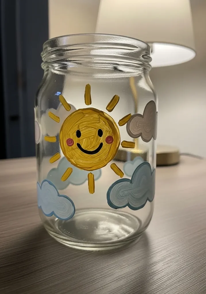 I love crafts that instantly boost the mood and this one definitely does that. Painting a smiling sun feels playful and lighthearted which makes the project perfect for beginners. It is the kind of jar that makes me smile every time I see it sitting on a shelf. I can imagine placing a small candle inside so the sun glows warmly in the evening.