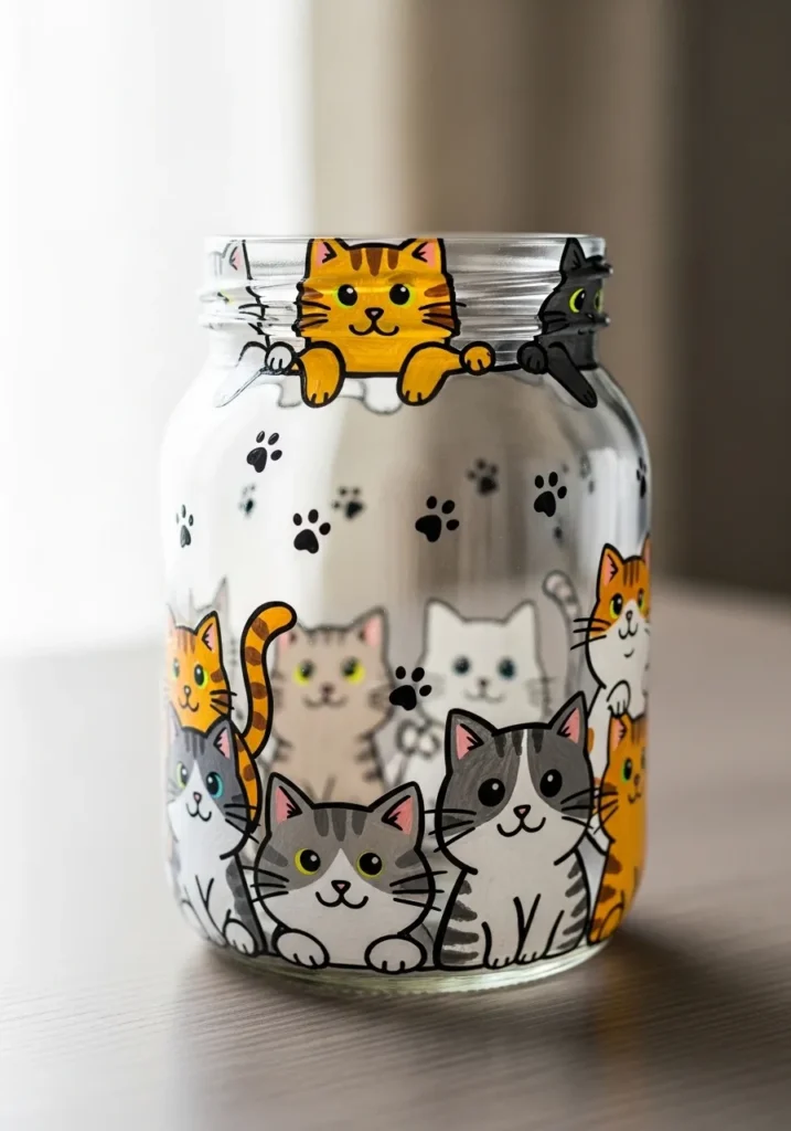 I always think animal themed jars bring so much personality to a craft project. Painting different cat faces feels fun because each one can have its own expression. This kind of jar would make a perfect gift for any cat lover. I would happily use it as a cute container for pens, brushes, or small craft tools.
