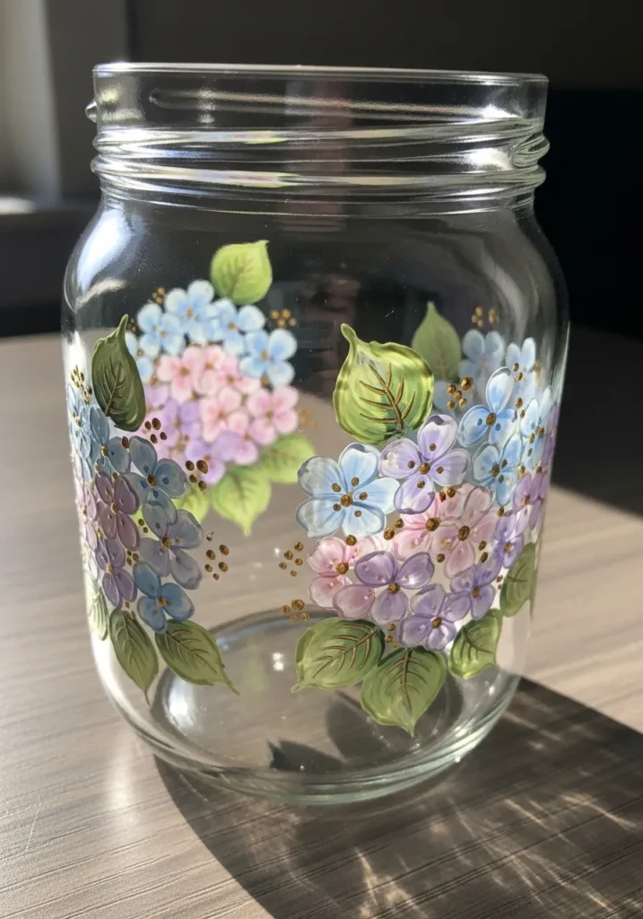 Whimsical Hand-Painted Hydrangea Glass Jar