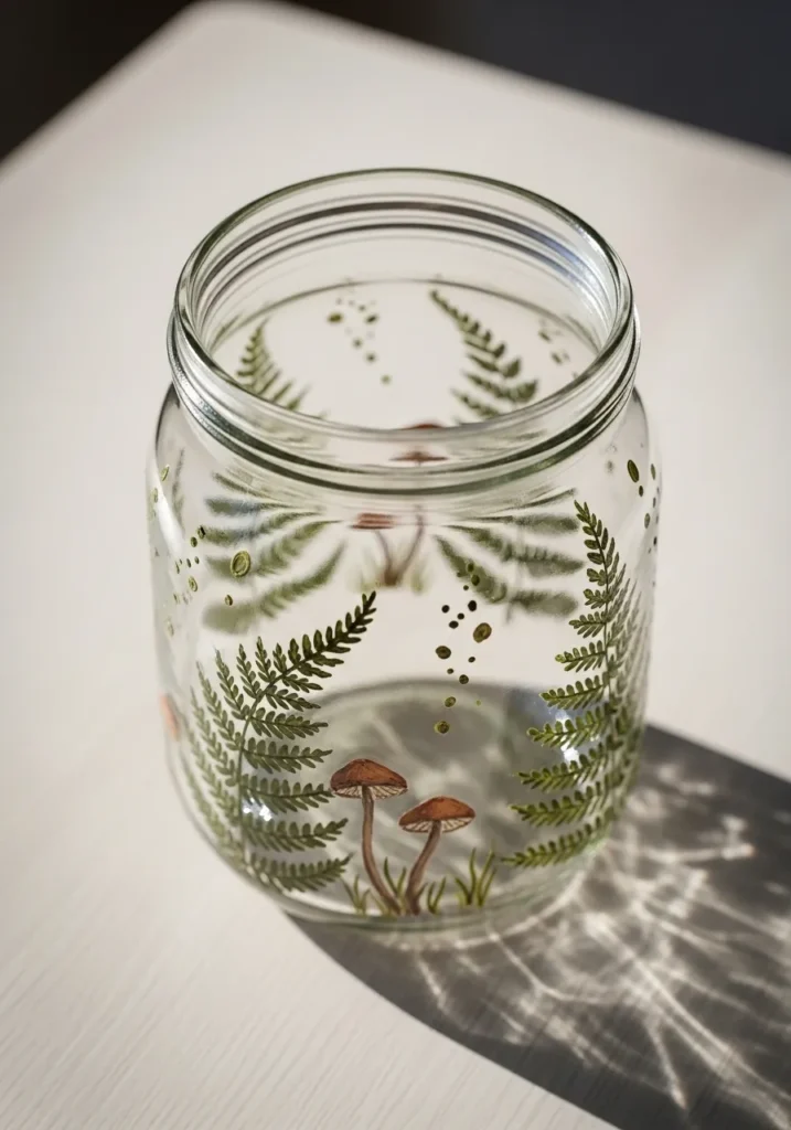 This glass jar features a whimsical nature scene that feels like a quiet walk through an enchanted forest. The design showcases long, graceful fern fronds in varying shades of mossy and forest green, painted with fine lines to give them a delicate, feathery texture. Tucked between the greenery are tiny, earthy brown mushrooms with slender stems and soft tan caps, adding a touch of cottagecore charm. Dainty clusters of olive green dots float around the foliage, mimicking forest spores or magical sparkles against the clear glass.