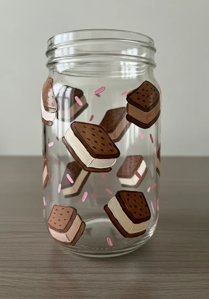 This adorable glass jar features a whimsical pattern of floating ice cream sandwiches that look almost good enough to eat. Each little treat is painted with rich cocoa brown rectangles for the cookies and creamy white or soft pink layers representing the delicious ice cream center. Tiny dark dots on the cookies add a realistic touch, while bright pink sprinkles are scattered across the clear glass to fill in the gaps with a pop of color. The illustrations have a slightly raised texture from the thick paint, and the clean black outlines give every sandwich a fun, graphic feel that really stands out.