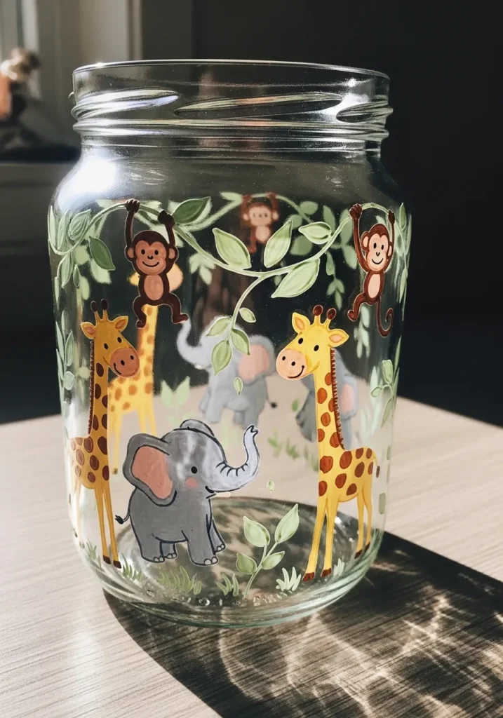 This charming, clear glass jar features a whimsical cast of jungle characters that look like they stepped right out of a premium storybook. The design showcases long-necked giraffes with warm yellow coats and brown spots, playful grey elephants with rosy pink ears, and cheeky little monkeys swinging from leafy green vines. The artist used opaque acrylics to give the animals a solid, high-quality finish while keeping the outlines crisp and the expressions friendly. Lush green leaves and soft grass patches wrap around the bottom and top of the jar, creating a full, immersive scene that makes the most of the transparent background.