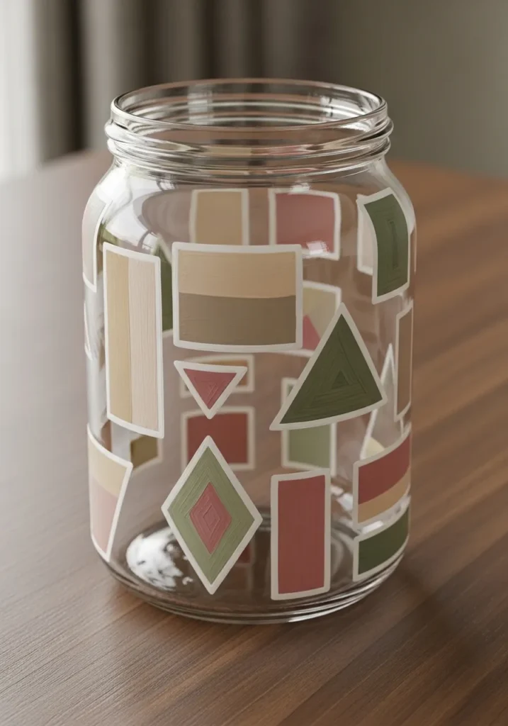 This clear glass jar takes a stylish trip back in time with a collection of mid-century modern geometric shapes. The design features a sophisticated palette of muted earth tones including sage green, terracotta, sandy beige, and deep olive. Each shape, from tall rectangles and sharp triangles to elegant diamonds, is bordered by a crisp white outline that makes the colors pop against the transparent background. The paint is applied with a smooth, matte finish, giving the overlapping forms a clean and intentional look that feels more like a piece of boutique glassware than a simple DIY project.
