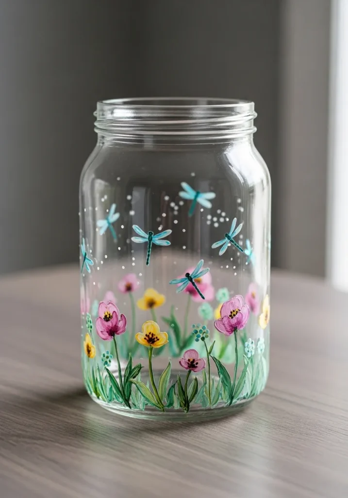 I am genuinely captivated by how this design captures the quiet magic of a summer evening. If you’re into the cottagecore aesthetic, this is a must-try project because it combines simple floral shapes with those adorable, fluttering insects. It is such a lovely way to turn an everyday jar into a dreamy centerpiece that looks especially beautiful when it catches the natural light on a windowsill. Plus, painting those tiny white “sparkles” is incredibly satisfying and instantly makes the whole piece feel like a professional work of art.