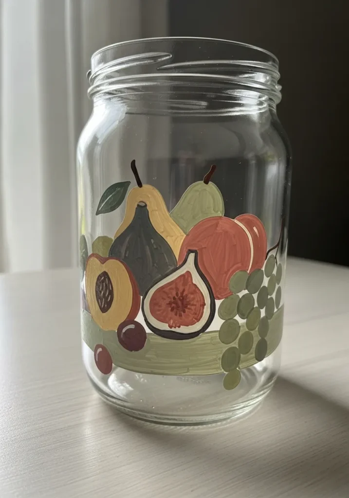 I am genuinely struck by how elegant and “grown-up” this specific fruit pattern looks on a simple glass surface. If you’re looking to elevate your pantry or kitchen counter, this is a fantastic project because it moves away from bright primary colors toward a more refined, earthy vibe. It is such a clever way to practice painting different textures, from the fuzzy skin of a peach to the glossy surface of a grape. This jar would look absolutely stunning filled with dried pasta or artisanal snacks in a rustic, farmhouse-style kitchen.