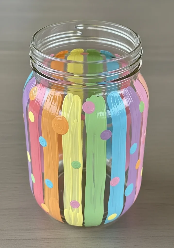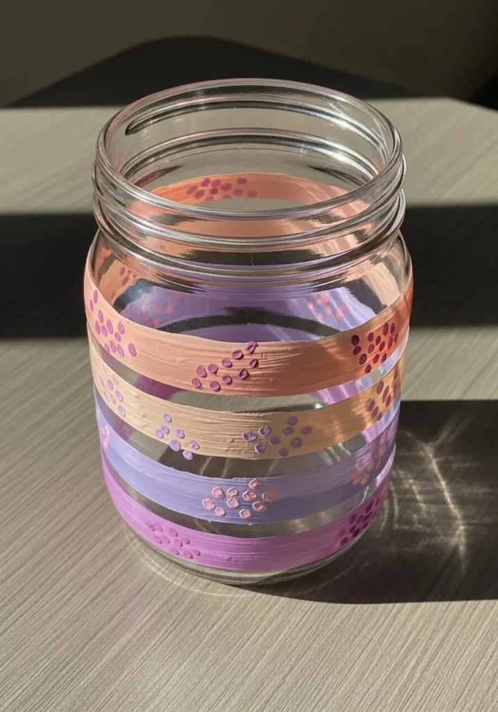 I find this design so incredibly soothing to look at because of that gorgeous gradient of purples. If you’re a fan of the relaxed, “modern boho” look, this project is a total win because the stripes don’t need to be perfectly straight to look intentional and artistic. It is such a brilliant way to transform a plain kitchen jar into a stylish holder for cotton rounds on a bathroom vanity or even a chic pen cup for your office. Plus, playing with those little raised dots is such a satisfying way to add a bit of 3D flair to your glass painting game!