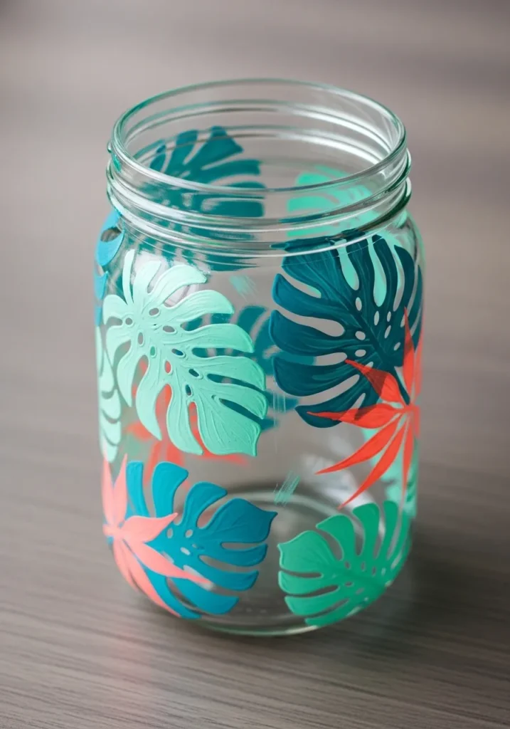 This design brings a punchy jungle vibe to a classic clear glass jar through bold layered leaves. The color palette is a refreshing mix of teal, mint green, and deep forest hues, accented by unexpected pops of bright coral. Each monstera leaf is painted with thick acrylics that create a slightly raised texture, giving the jar a tactile and high-end feel. The overlapping patterns and varied leaf shapes make the glass appear almost like a designer terrarium without the maintenance of real plants.
