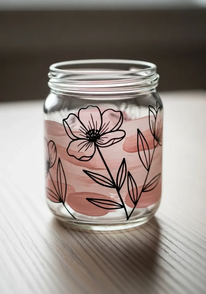 This sophisticated, clear jar features a dreamy, minimalist design that combines organic paint strokes with crisp line art. A thick band of dusty rose and blush pink acrylic paint is swept horizontally around the center of the glass, showing off a beautiful, textured “dry brush” effect where the bristles left behind delicate wisps of color. Layered right on top are large, graceful flowers drawn with bold black outlines. The contrast between the soft, painterly background and the sharp, architectural floral lines creates a balanced look that feels very modern and high-end.