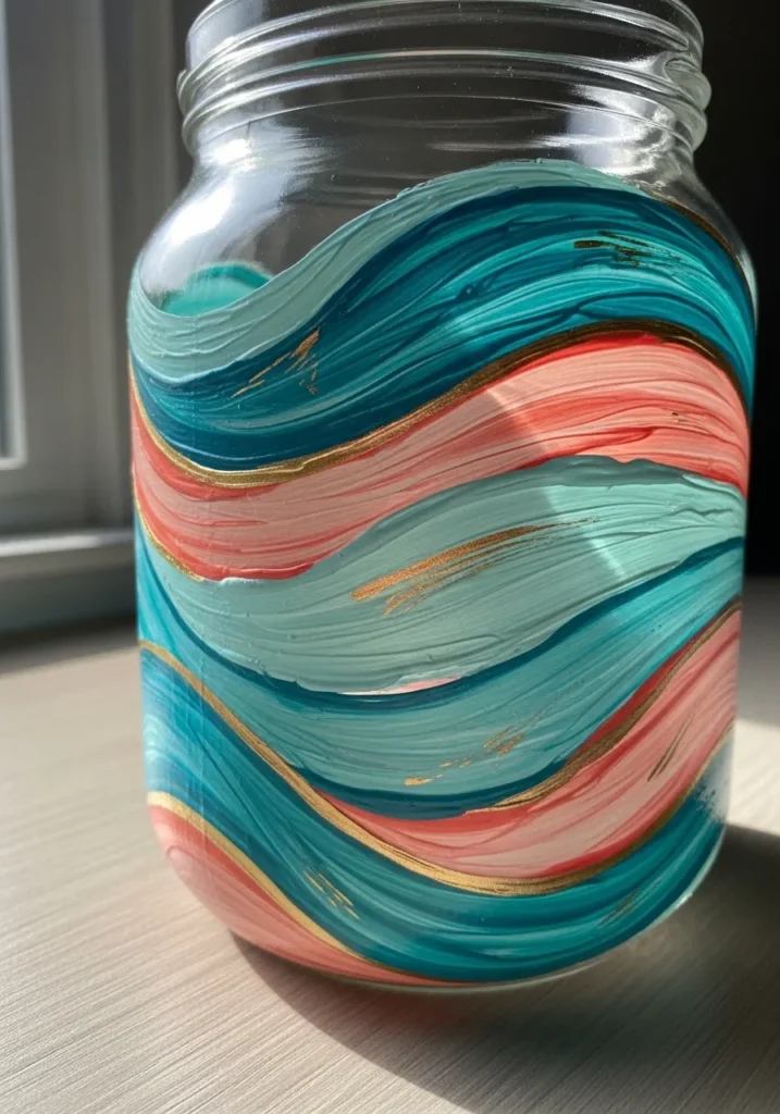 This clear glass jar is transformed into a dynamic piece of art with a series of bold, sweeping horizontal waves. The color palette is a sophisticated mix of deep teal, bright turquoise, and a soft coral-pink. What makes this design truly stand out is the incredible texture; the paint is applied in thick, impasto-style layers where you can actually see the grooves of the brushstrokes. To add a touch of luxury, thin lines of metallic gold are woven between the colorful layers, catching the sunlight and giving the whole piece a shimmering, high-end finish.