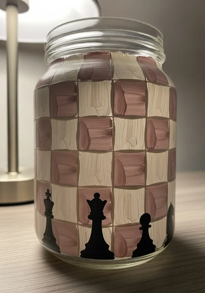 This clear glass jar is transformed into a sophisticated, game-themed decorative piece featuring a hand-painted checkerboard pattern. The grid is rendered in alternating squares of creamy off-white and a dusty rose pink, applied with thick, visible brushstrokes that give the surface a rich, textured feel. Along the bottom edge of the jar, solid black silhouettes of chess pieces—including a king, queen, pawn, and knight—are meticulously painted, creating a sharp contrast against the softer colors of the board above.