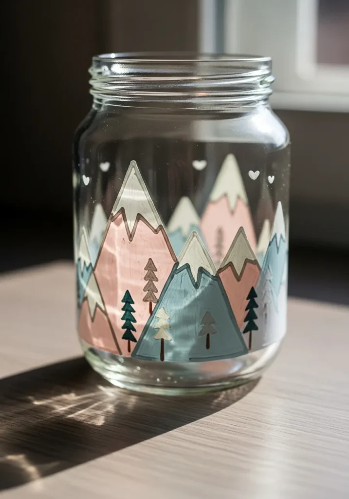The final piece in our collection is a breathtaking, clear glass jar that brings the majesty of a mountain range right to your tabletop. This design features a series of geometric mountain peaks in a serene palette of dusty rose, muted teal, and cool slate blue. Each mountain is capped with a crisp layer of opaque white paint to mimic fallen snow, while dark outlines give the peaks a clean, modern look. To complete the wilderness scene, tiny evergreen trees are dotted along the base, and small white hearts float in the “sky” like gentle snowflakes.