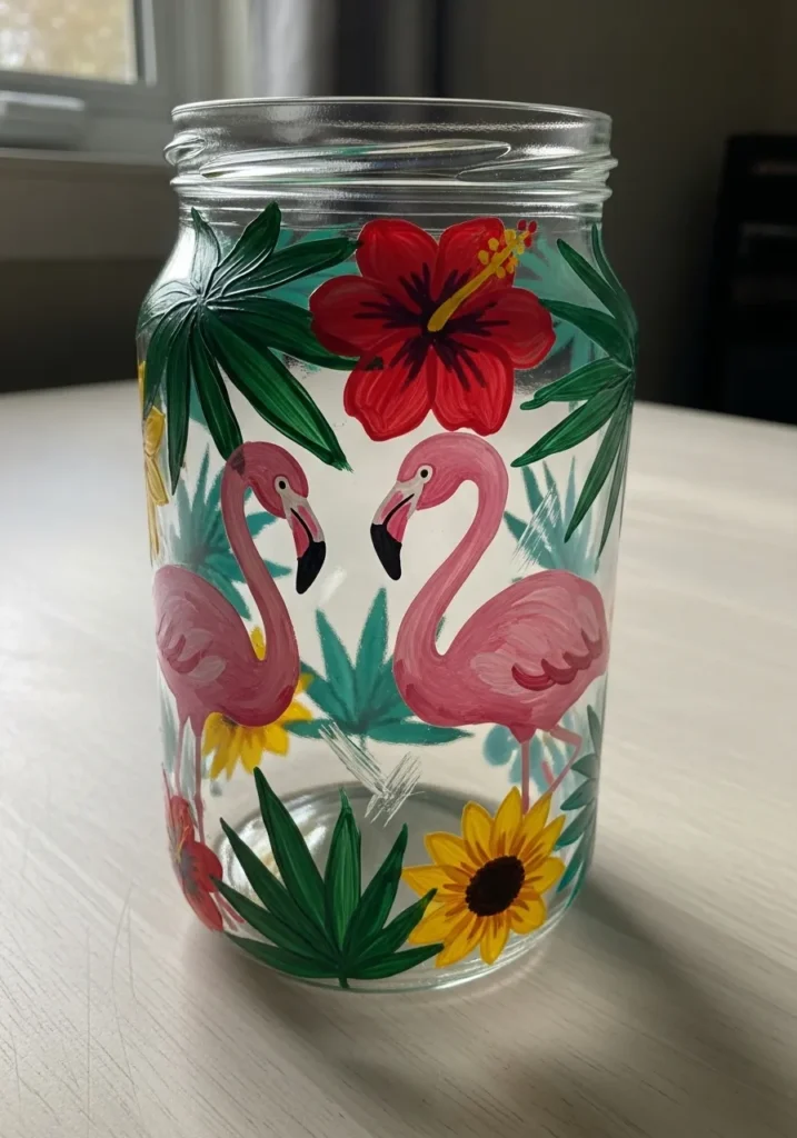 This vibrant glass jar captures a sun-drenched vacation mood with its pair of graceful pink flamingos facing one another. The design is framed by lush, deep green palm fronds and oversized hibiscus blooms in a bold, primary red. To add even more sunshine, bright yellow sunflowers are tucked around the base, creating a multi-layered botanical look. The paint is applied with visible, sweeping brushstrokes that give the feathers and petals a lovely hand-painted texture, making the clear glass feel like a high-end piece of tropical decor.
