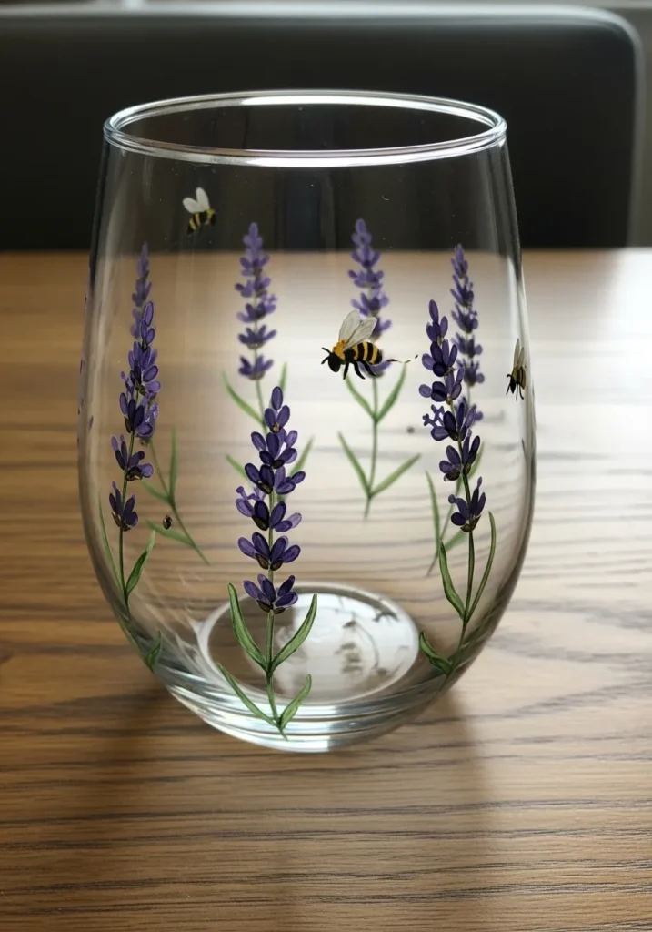 This stemless wine glass features hand-painted sprigs of lavender reaching up from the base in rich shades of violet and deep purple. Tiny green leaves add a natural touch while small yellow and black bumblebees flit between the floral stems. The paint has a smooth, slightly raised texture that makes the garden scene pop against the clear glass. It feels delicate yet sturdy enough for a cozy evening drink.