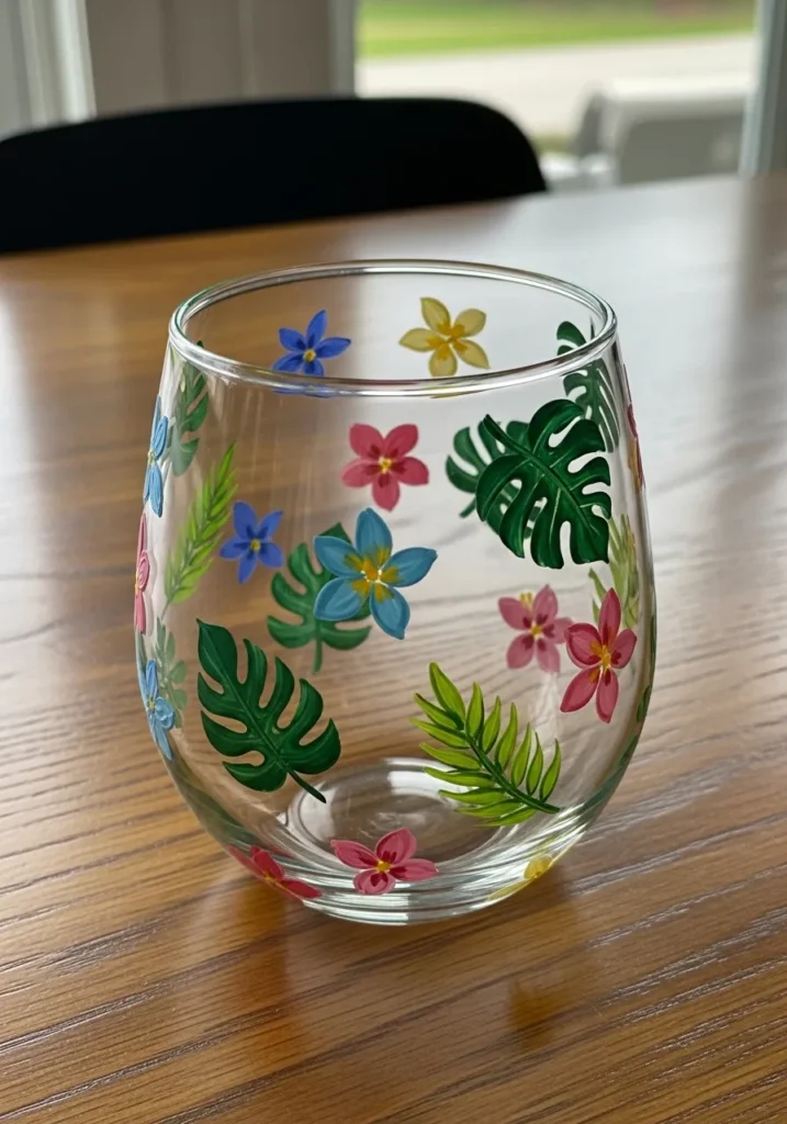 Painting these motifs is a fun way to bring vacation vibes right into your kitchen. I am a huge fan of how the different leaf shapes add variety without being too difficult to sketch out first with a washable marker. It is a fantastic project for a girls’ night because everyone can pick their own flower colors to make a truly unique set of glasses that feel like a tiny piece of paradise.