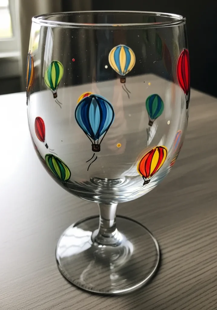 This stemmed glass captures a whimsical sky filled with vibrant hot air balloons in an array of primary colors. You can see balloons in bold shades of cherry red, emerald green, sunny yellow, and deep sapphire blue drifting across the clear glass surface. Each balloon features vertical striped detailing and a tiny brown basket hanging below with delicate black strings. Small colorful dots are scattered in the background to add a sense of celebration and movement to the overall festival theme.