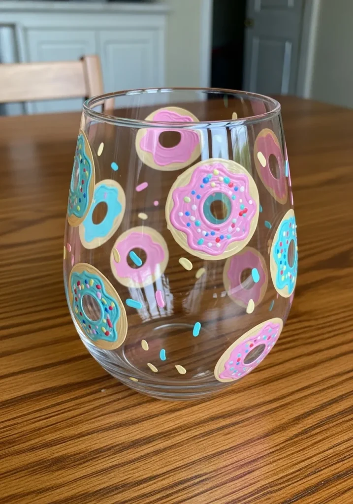 This playful stemless glass is decorated with a variety of hand painted donuts that look good enough to eat. Each pastry features a golden tan base topped with thick textured frosting in pastel pink and soft turquoise blue. Tiny multi colored sprinkles are dotted across the icing while loose sprinkles float in the spaces between the donuts to complete the sugary theme. The glossy paint gives each donut a realistic sheen that stands out beautifully against the clear glass.
