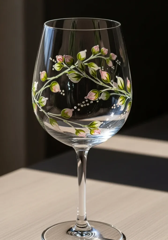 This wine glass displays a graceful vine design featuring delicate pink buds and variegated green leaves that wrap around the bowl. The artist used a blending technique with soft rose, sage green, and white glass paint to give the botanical elements a realistic and airy texture. Tiny white dots are strategically placed along the stems to add a touch of sparkle and detail that enhances the overall romantic and feminine aesthetic.