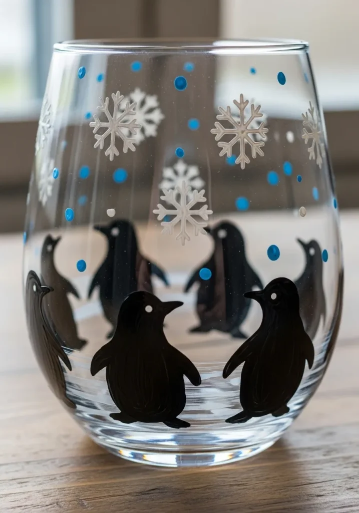 This stemless wine glass features an adorable winter theme with a circle of black penguin silhouettes standing amid a flurry of snowflakes. The artist used opaque black paint for the penguins and a crisp white for the detailed snowflake patterns and snowy ground. Bright blue and white dots are scattered around the top to represent falling snow, creating a lovely sense of movement and depth across the clear glass surface.
