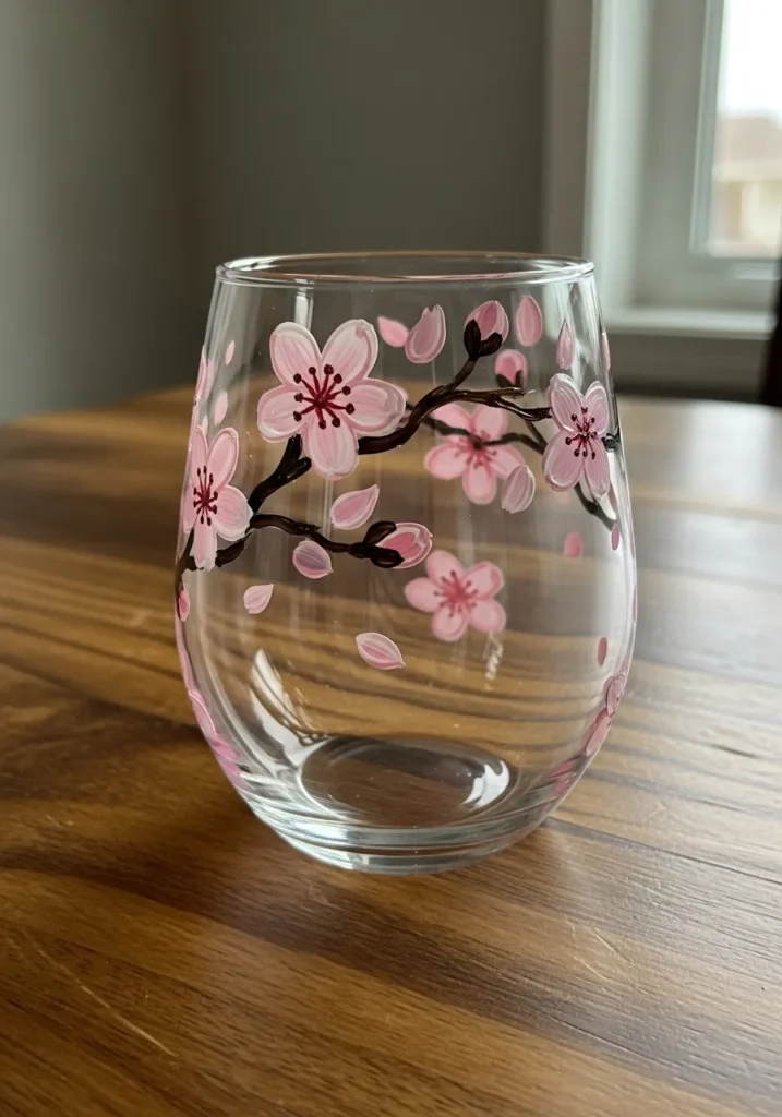 This delicate stemless glass has a winding dark brown branch adorned with soft pink cherry blossoms in various stages of bloom. Each flower shows off layered petals in light and medium pink tones with tiny magenta centers and dark stamens for a realistic touch. A few stray petals are painted as if they are floating in the breeze around the main branch which adds a lovely sense of motion to the design. The paint is applied with smooth brushstrokes that give the floral scene a gentle and feminine feel against the clear glass.