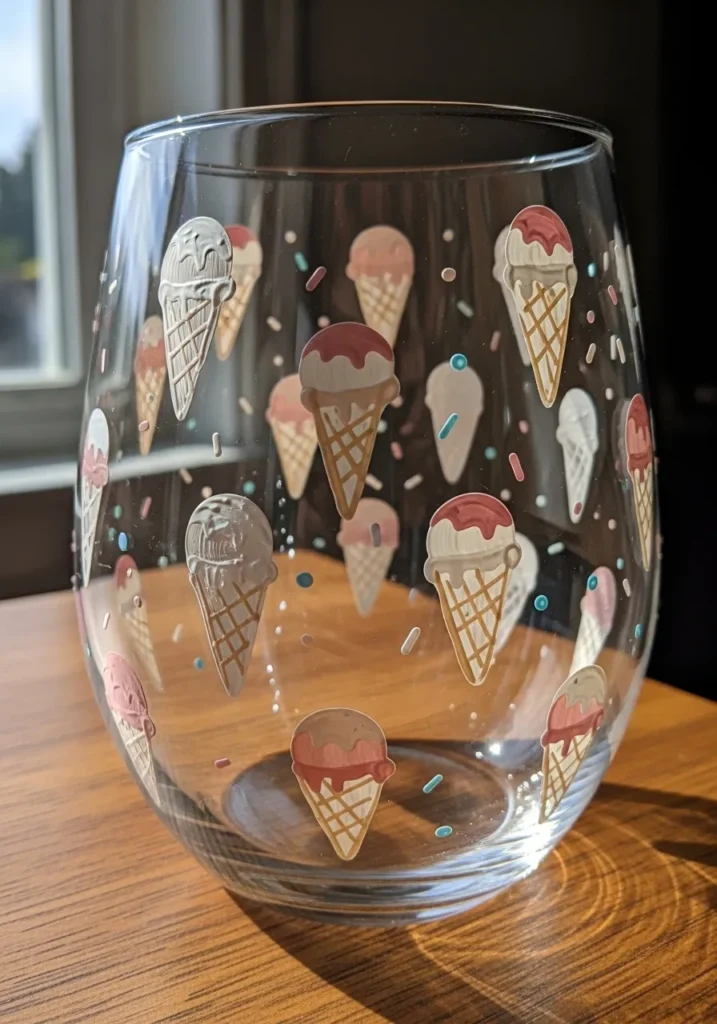 This stemless wine glass includes a delightful pattern of hand painted ice cream cones in soft pastel shades. The artist used a creamy palette of strawberry pink, vanilla white, and caramel tan glass paint to create the scoops while the waffle cones show off a detailed tan lattice texture. Tiny colorful sprinkles in mint green and sky blue are scattered between the cones to add a playful and celebratory feel that covers the entire surface of the glass.