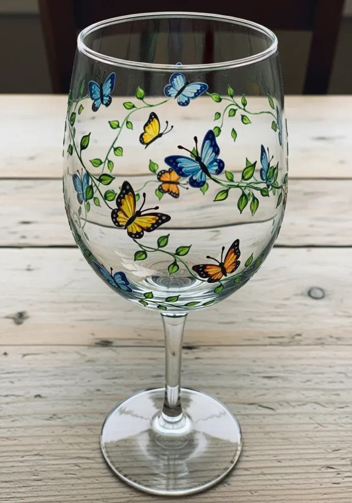 This stemmed wine glass has a whimsical scene of colorful butterflies fluttering around winding green vines. The butterflies are painted in vibrant shades of azure blue, sunny yellow, and burnt orange with fine black detailing on their wings and tiny antennae. Delicately curved vines with small teardrop leaves wrap around the bowl of the glass to create a sense of natural movement. The paint has a smooth opaque quality that makes the garden details pop against the clear glass for a bright and airy look.