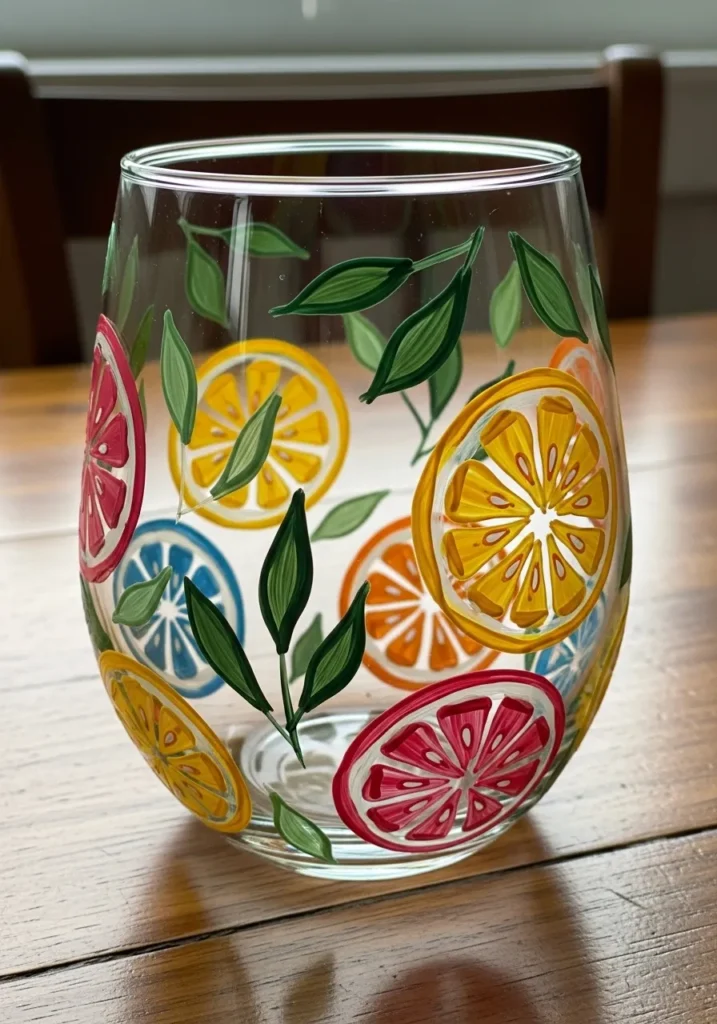 If you want a project that is nearly impossible to mess up, then these citrus slices are the perfect starting point. I am a huge supporter of using simple circular shapes to build confidence since they look amazing even if your lines aren’t perfectly straight. It is such a bright and happy way to customize your glassware for summer patio parties or a colorful birthday gift.