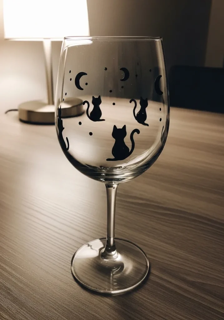This wine glass showcases a charming and minimalist design featuring solid black cat silhouettes sitting under crescent moons. The artist used opaque black glass paint to create crisp and clean shapes that wrap around the bowl for a playful 360-degree view. Tiny black dots are sprinkled throughout the design to represent a subtle night sky effect, while the smooth finish of the paint provides a bold contrast against the clear glass.