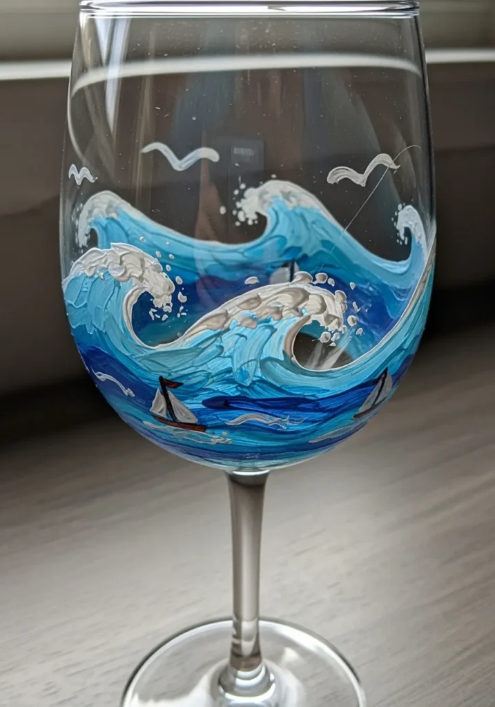 This stemmed wine glass highlights a dramatic coastal scene with swirling ocean waves in shades of turquoise, cerulean, and deep navy blue. Thick white paint creates a foamy texture at the crest of each wave, giving the design a sense of movement and energy. Small sailboats with white sails and tiny red accents glide across the water while simple white seagulls soar through the clear space above. The brushstrokes are visible and bold, adding a hand-painted charm that wraps beautifully around the curve of the glass.