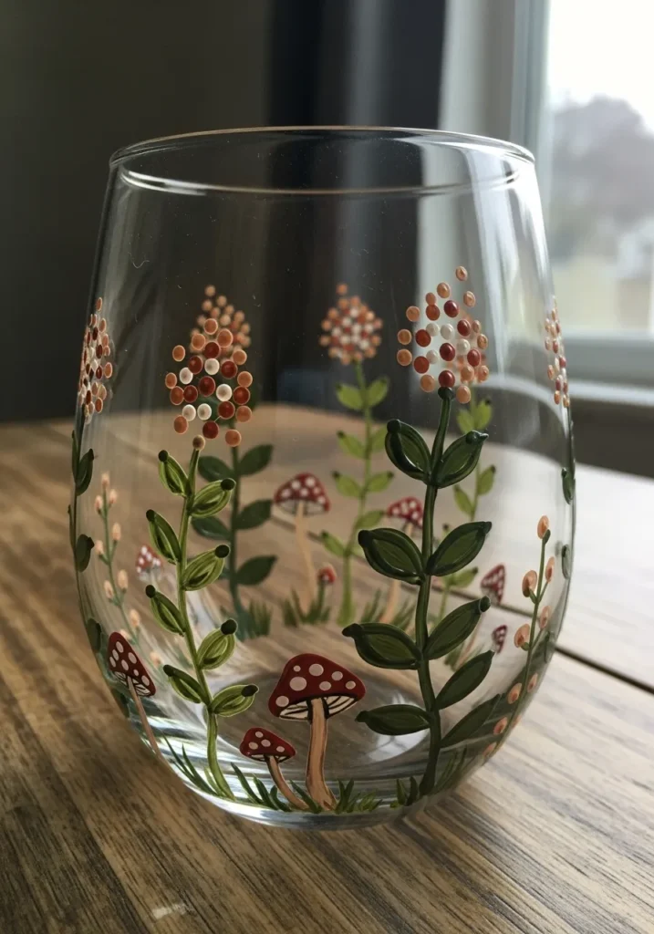 This stemless wine glass has a charming forest floor scene filled with spotted red mushrooms and tall leafy wildflowers. The artist used rich earthy tones like deep moss green, warm terracotta, and creamy white to bring the botanical details to life. You can see a lovely mix of textures from the smooth painted stems to the raised dots forming the flower heads, which gives the whole piece a wonderful handcrafted feel.