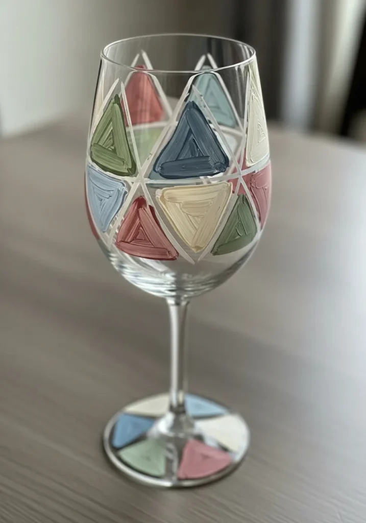 This wine glass features a bold geometric pattern made of colorful triangles framed by crisp white borders. The design uses a muted palette of sage green, dusty rose, slate blue, and buttery cream glass paint to create a sophisticated mosaic effect. Thick visible brushstrokes inside each triangle add a lovely tactile texture, while the repeated pattern extends all the way down to the base for a fully finished look.