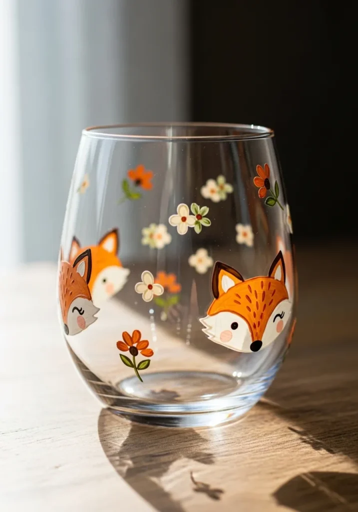 This adorable stemless glass includes hand-painted fox faces in a warm burnt orange and creamy white palette. Each little fox has delicate black detailing for the eyes and ears with tiny pink blush spots on the cheeks for extra personality. Scattered between the foxes are simple four-petal flowers in shades of orange and ivory with small green leaves adding a pop of nature. The paint is applied in a smooth, opaque style that makes the woodland characters stand out beautifully against the clear glass.