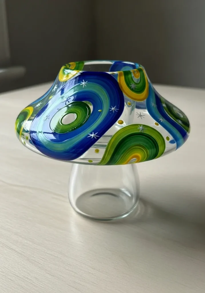 This playful little glass lamp shade looks like a tiny burst of color sitting on top of a simple jar base. The shade is painted with bold swirling circles in bright green, deep blue, and touches of yellow that feel almost hypnotic. The glossy glass surface lets light bounce through the colors, which gives the whole piece a cheerful glow. The shape is soft and rounded like a small mushroom cap, and the clear glass base keeps the design feeling modern and light.