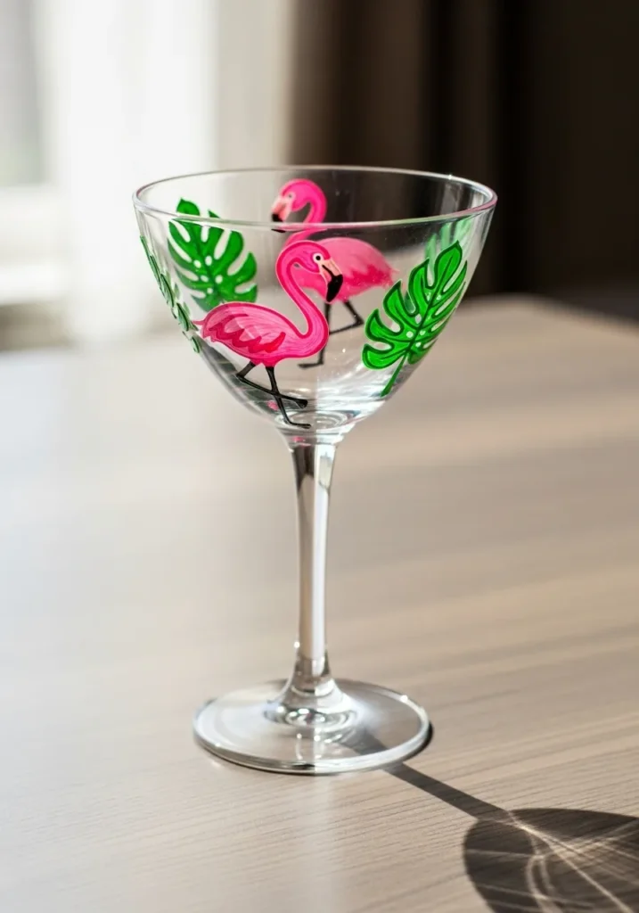 This playful martini glass features a bright pink flamingo standing proudly among vibrant green tropical leaves. The flamingo is painted in bold pink tones with simple curved lines that capture its fun shape. The surrounding leaves add a splash of fresh green color that makes the whole design feel lively and tropical. The clear glass keeps the look modern while the colorful artwork brings a cheerful personality.
