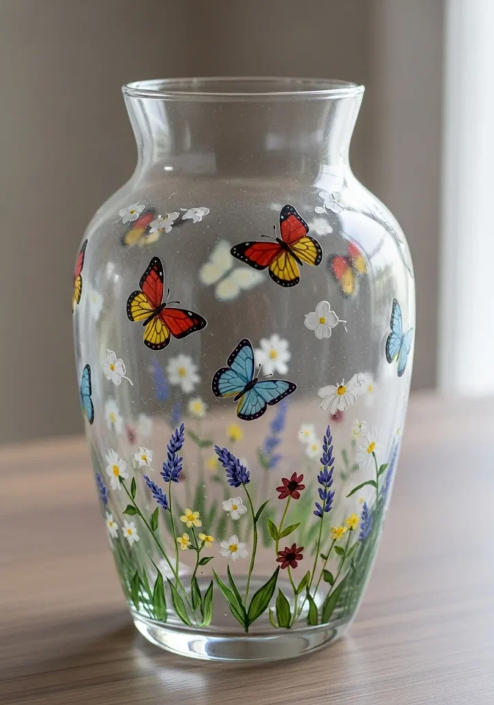 This charming glass vase is decorated with delicate wildflowers growing around the base while colorful butterflies flutter above them. The flowers are painted in soft meadow shades like lavender, yellow, and pale blue. Small green stems and leaves fill in the design and give the vase a natural garden feel. The butterflies add little bursts of color with orange and blue wings that stand out beautifully against the clear glass.