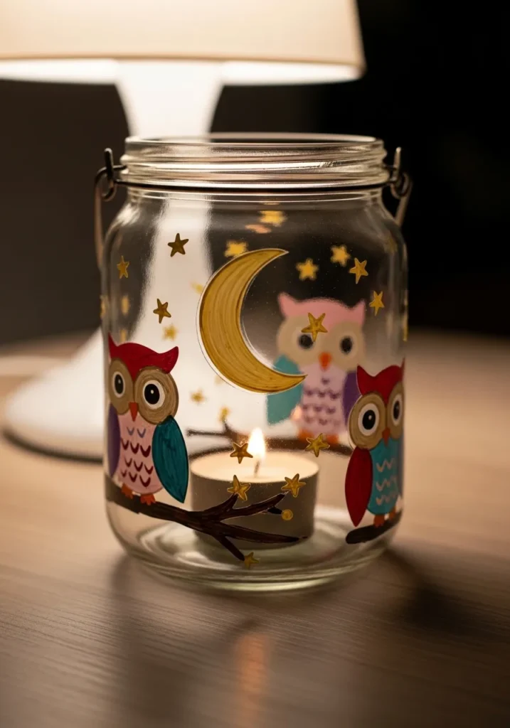 I think lantern style jar crafts are some of the most rewarding projects to make. The painting itself is simple and fun, especially when working with cute characters like owls. Once a small candle is added inside, the jar instantly becomes a charming little night light that looks perfect on a shelf or bedside table.